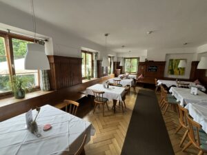 Das Gebäude entstand bereits im 18. Jahrhundert. Geschichte spiegelt sich an der wirtshaustypischen Einrichtung, die mit Holz und Patina für ungezwungene Gemütlichkeit steht. Nicht von gestern, sondern zeitgemäß präsentiert sich die Karte von Küchenchef Wolfgang Erdmann. Der weiß offenbar, wie regionaltypische Tradition geht, vergisst darüber aber nicht, dass den besten Speisezettel die Jahreszeit schreibt. Das zeigt sich im Sommer zum Beispiel an der Spezialkarte, die Gerichte mit Pfifferlingen versammelt. Zur Herbst- und Winterzeit gibt es traditionelles Geflügel wie Gans und Ente.
